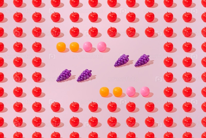 Творческая абстрактная летняя яблочная, виноградная, персиковая и оранжевая узоры плоского рисунка на пастельном розовом фоне минимализма