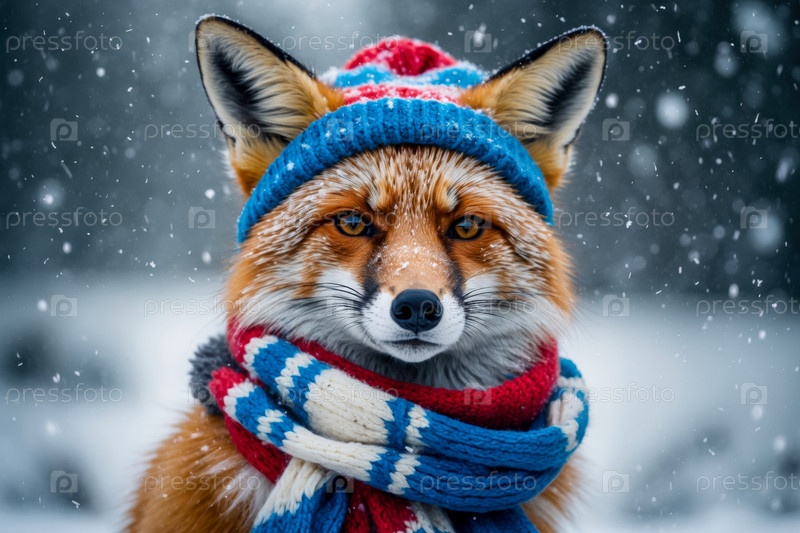 ИИ генеративный портрет лисы в вязанной зимней одежде шляпе и шарфе, животное во снежном снегу зимой