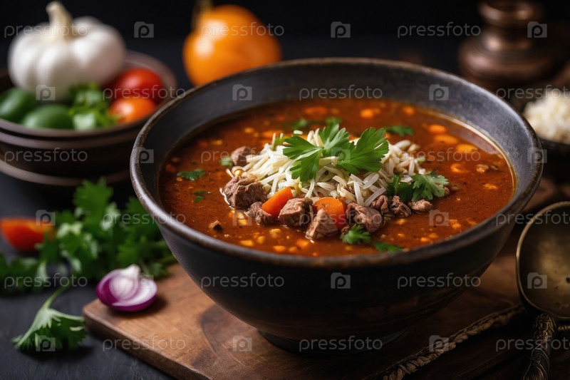 Традиционный грузинский суп харчо в миске ужин обед, овощ вегетарианская кухня AI Generative