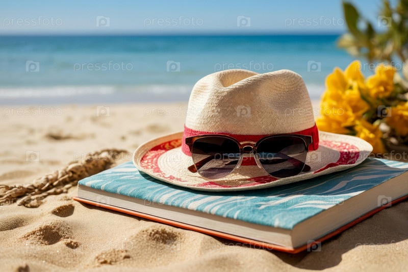 Still life summer tropical flat lay with attributes of vacation weekend on sea ocean AI Generative