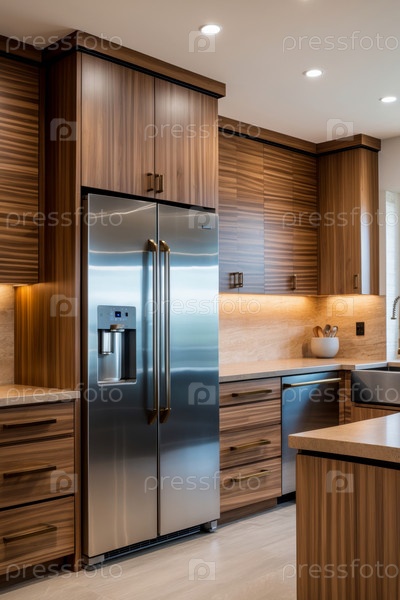 Современный стильный модный кухонный интерьер с деревянной мебелью и предметами домашнего обихода AI Generative