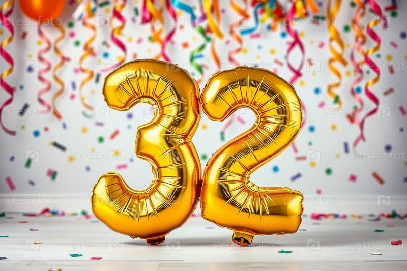 Гелий день рождения воздушный шар формы номер тридцать два, золотые буквы фигура 32 праздник праздничный фон декор