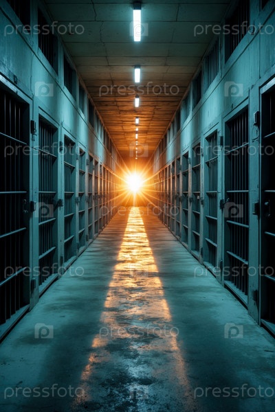 Интерьер тюремного здания внутри, коридор с изоляцией тюремной камеры стальные двери AI Generative
