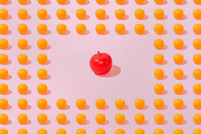 Творческий оранжевый и яблочный рисунок плоского уклада на пастельно-розовом фоне минимализма