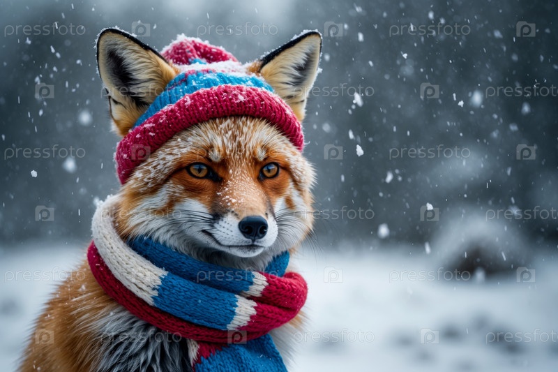 ИИ генеративный портрет лисы в вязанной зимней одежде шляпе и шарфе, животное во снежном снегу зимой