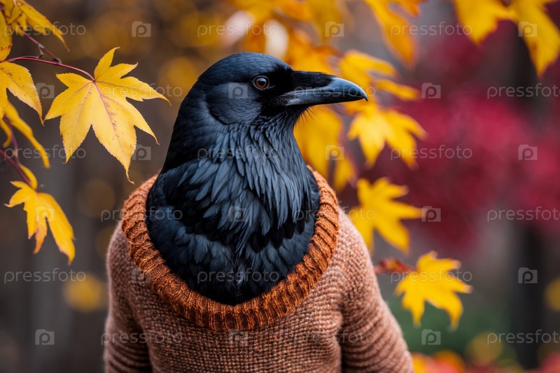 Ворона в трикотажном свитере осенний лесный фон, животное в красно-желтой листьях AI Generative