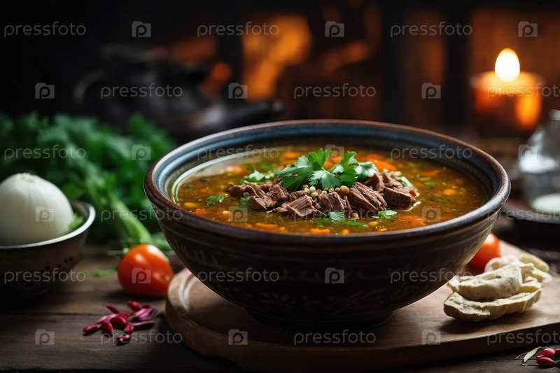 Traditional Georgian kharcho soup in bowl dinner lunch, vegetable vegetarian cuisine AI Generative