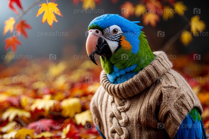 AI Generative Папуга в трикотажном свитере на осеннем лесном фоне, животное в красных и желтых листьях