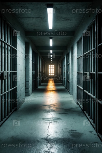 Интерьер тюремного здания внутри, коридор с изоляцией тюремной камеры стальных дверей AI Generative