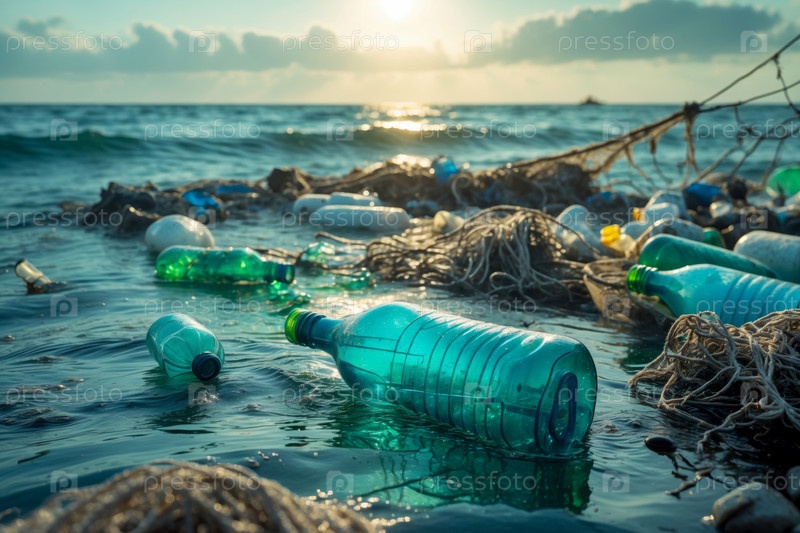 ИИ генеративное загрязнение окружающей среды морского океана побережье, мусорный полигон свалка на пляжном водоеме