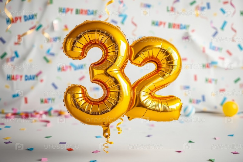Гелий день рождения воздушный шар формы номер тридцать два, золотые буквы фигура 32 праздник праздничный фон декор