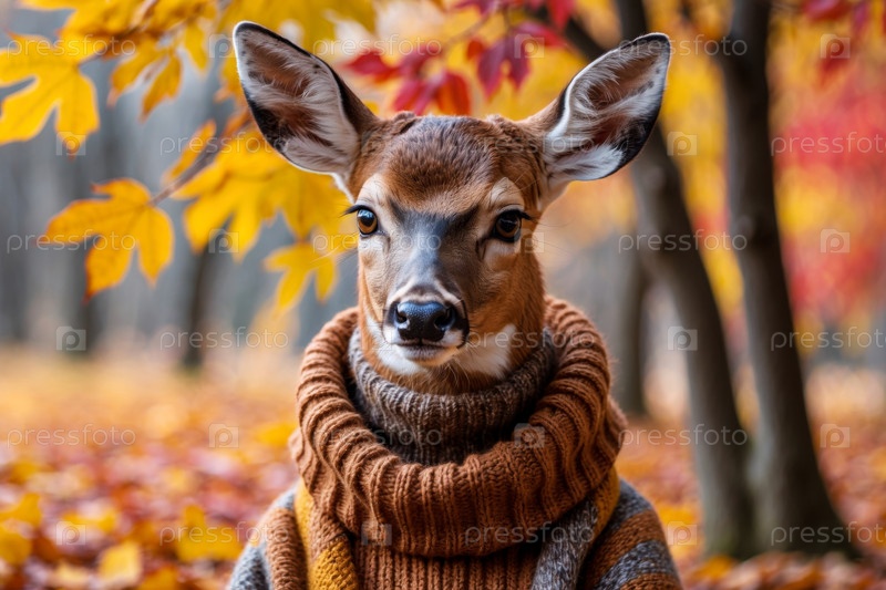 AI Generative Олень в трикотажном свитере на осеннем лесном фоне, животное с красными и желтыми листьями