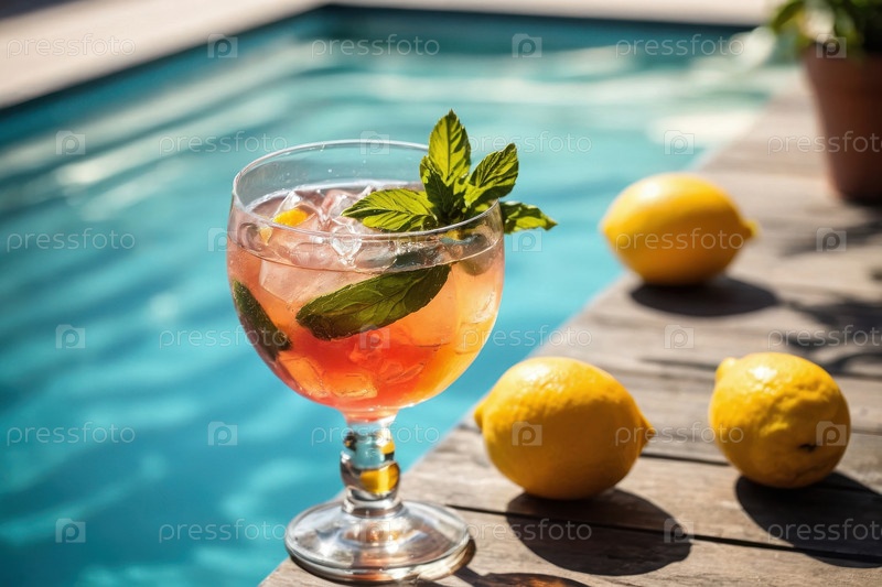 AI Generative Алкогольный коктейль на фоне бассейна, летний напиток фрукты в отпуске sea ocean