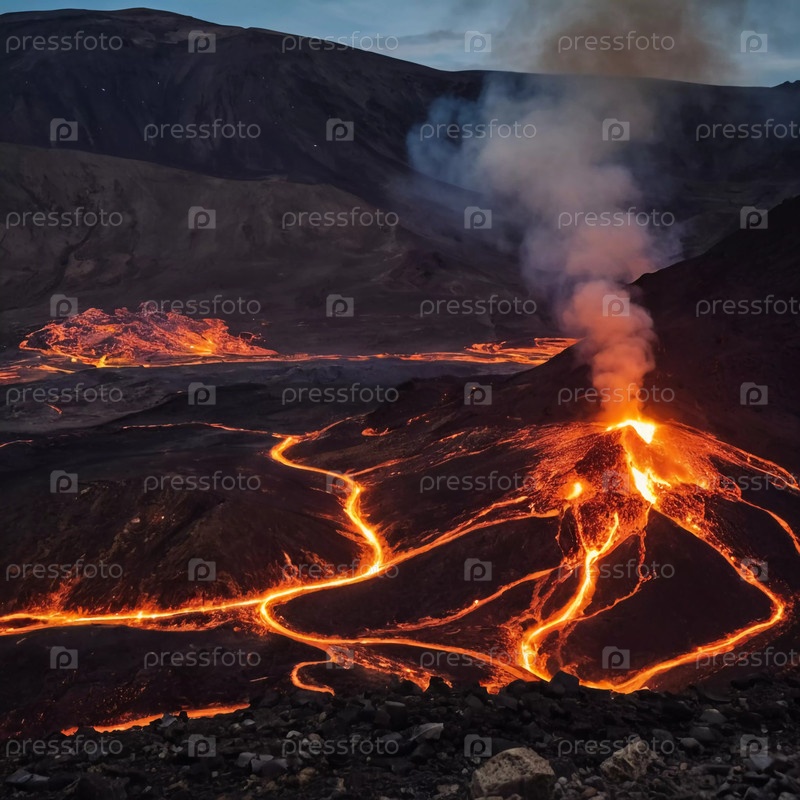 Извержение вулкана высвобождает эффектный поток горячей магмы, создавая светящиеся реки лавы, которые перемещаются через темную местность под сумеречным небом, демонстрируя сырую силу природы
