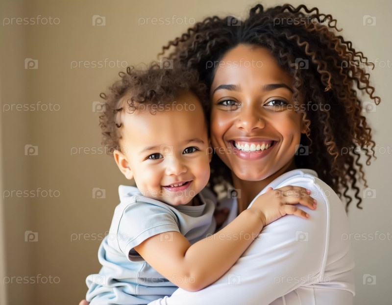 Теплый и воодушевляющий момент запечатлен матерью, которая держит своего счастливого ребенка. оба ярко улыбаются, наслаждаясь своим временем вместе в уютной комнате, наполненной любовью