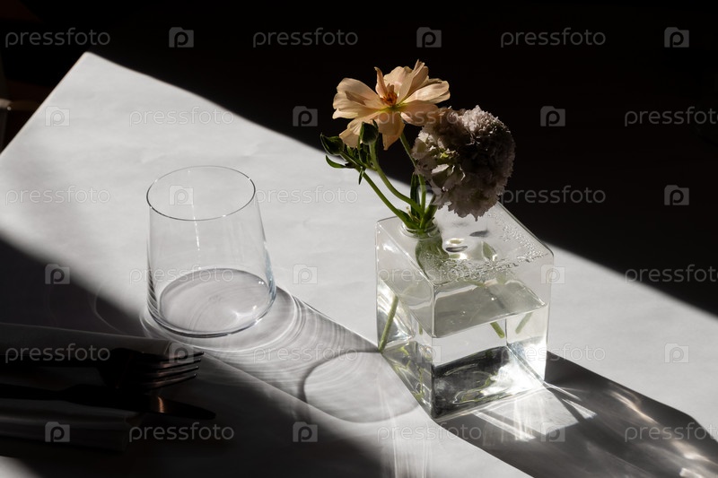 Стакан и ваза с цветком на белом столе