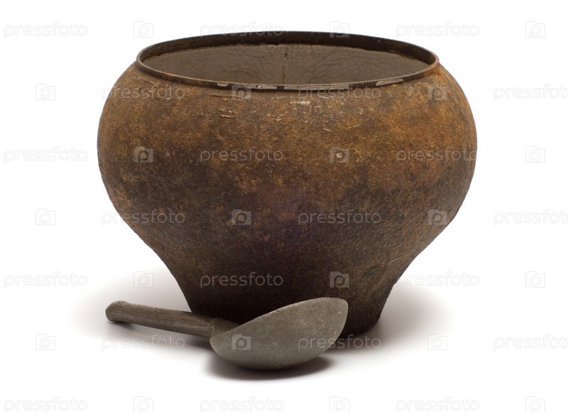 Старый чугунок и оловянная ложка на белом фоне