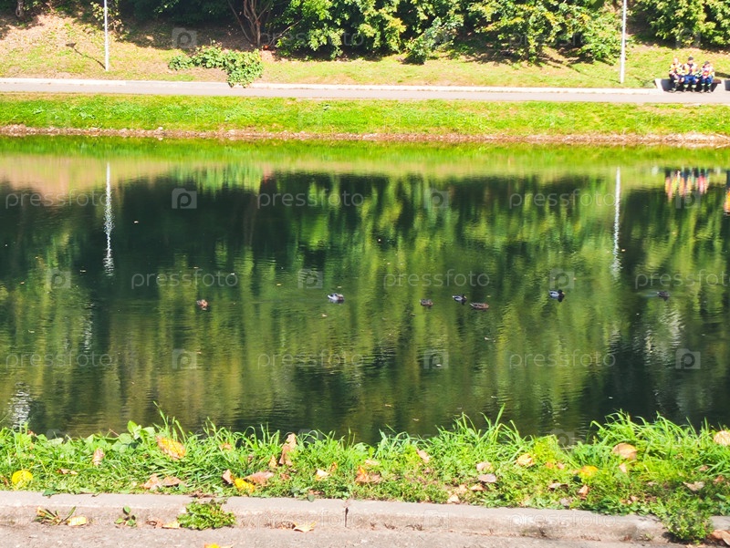 Спокойный парк пруда с утками, зеленые отражения и люди отдыхают на обочине дороги
