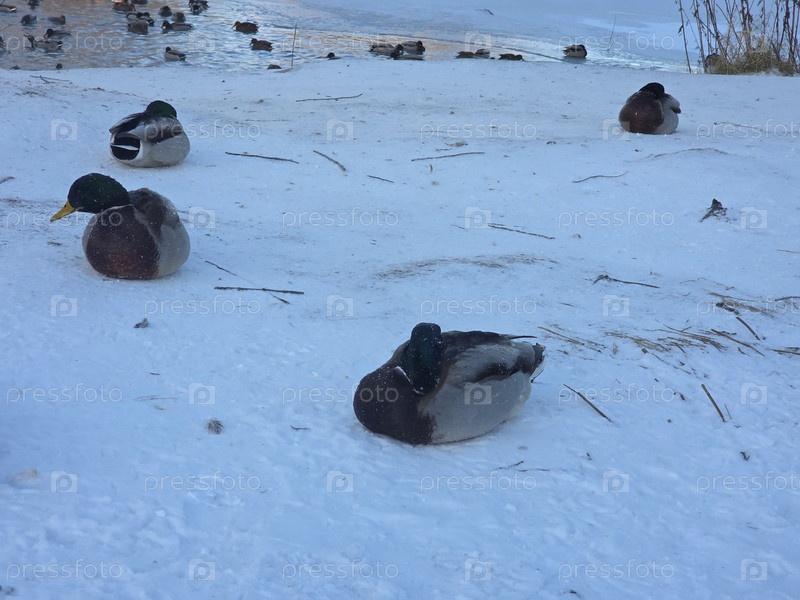 Сцена зимнего парка с большим стадом уток, собравшихся на снежном берегу рядом с замерзшим прудом, в окружении безлистных деревьев и дальних зданий под ярко-синим небом