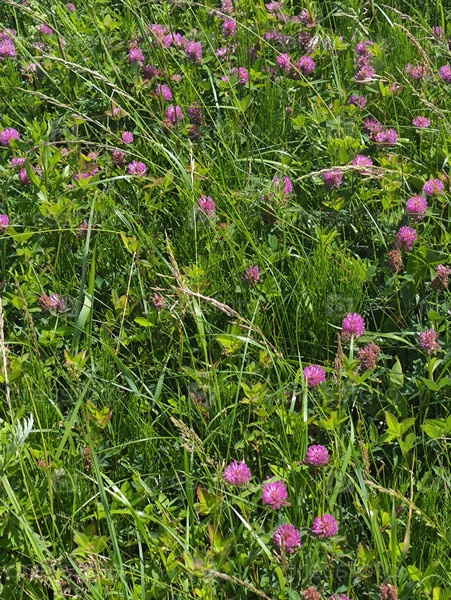 Розовый клевер на пышном лугу: яркие дикорастущие цветы, зеленые травы и солнечная природа