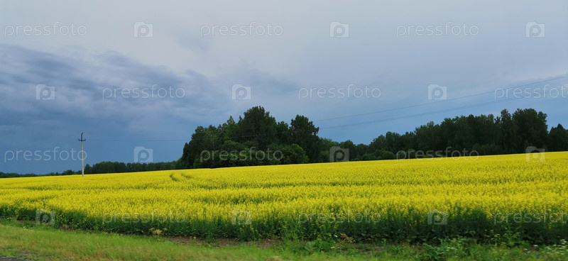Сельский летний пейзаж с лиственным лесом и рапсовым полем