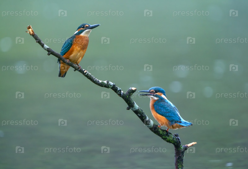 Два обыкновенных рыбака сидят на ветке над водой