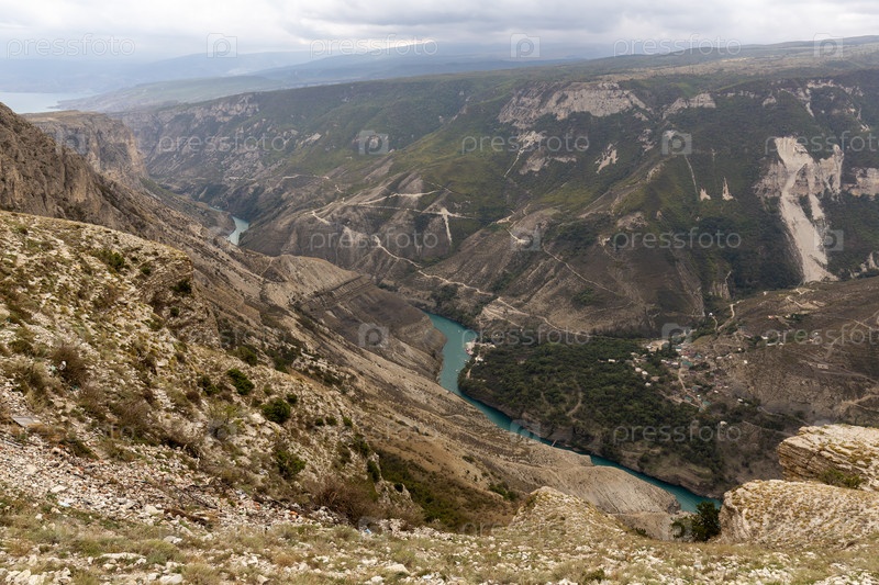 Панорама глубокого Сулакского каньона. Потрясающая изогнутая бирюзовая река среди высоких гор Северного Кавказа. Самый глубокий каньон в Европе. Путешествие по нагорью Республики Дагестан, Россия