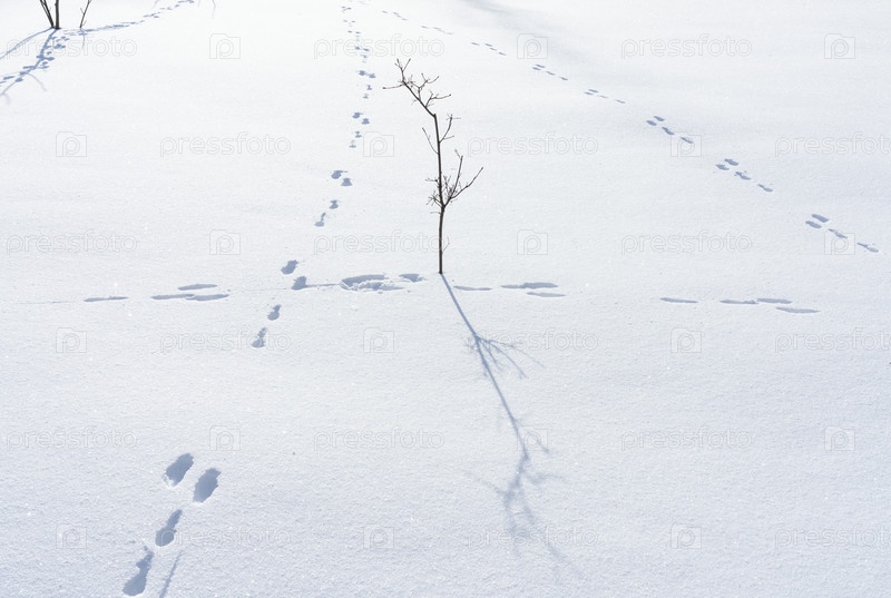 Снежное поле с одиноким деревом и следами зайца, зимняя природа
