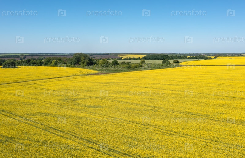 Бесконечные поля цветущего желтого рапса на холмистом ландшафте под голубым небом