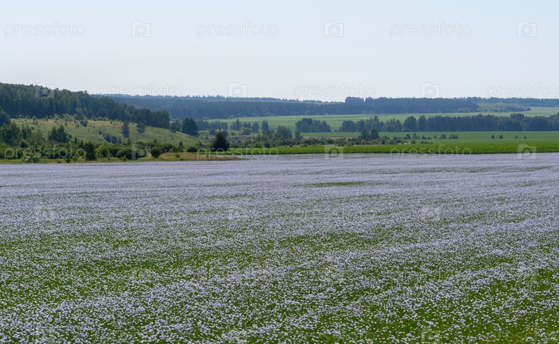 Поле цветущего синего льна на фоне зеленых холмов и лесов