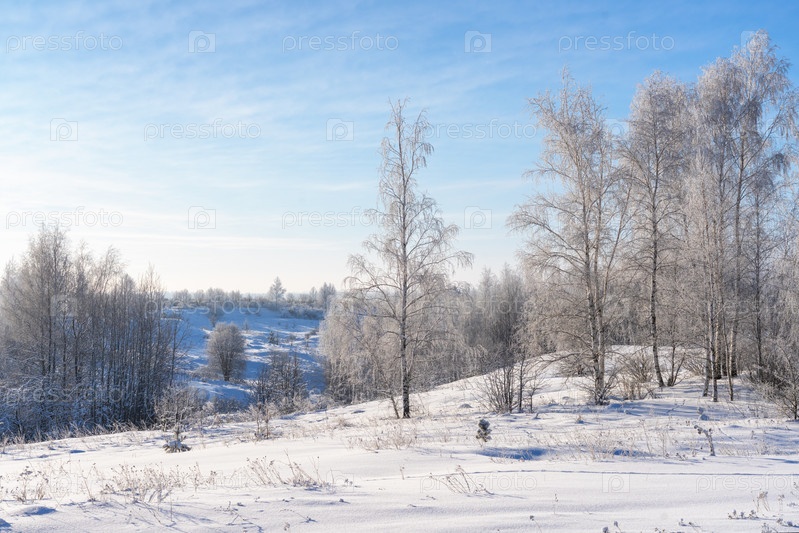 Солнечный зимний день, заснеженные поля и лес на горизонте