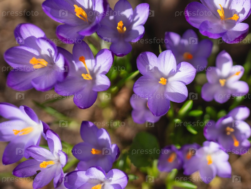 Фиолетовые крокусы с оранжевыми штаммами, вид сверху