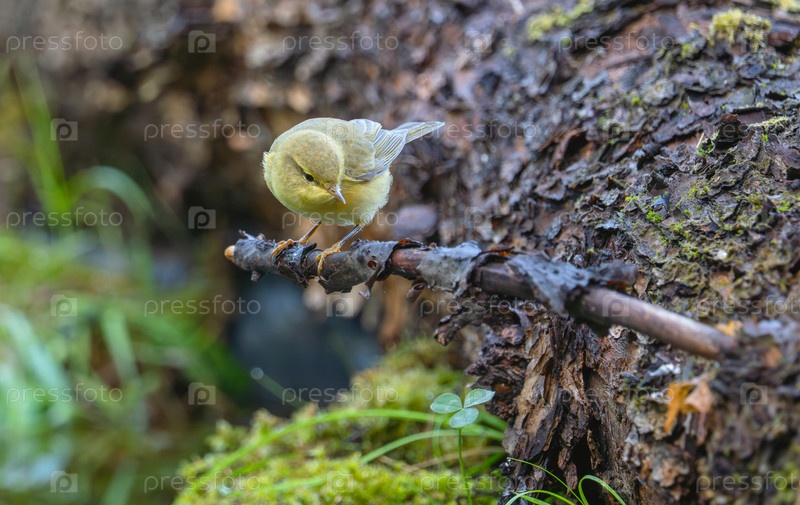 Верба (Phylloscopus trochilus) в весеннем лесу, сидящая на упавшем дереве с зеленой травой