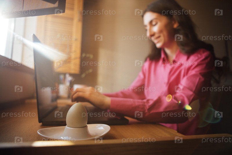 Молодая женщина в розовой рубашке работает на ноутбуке за деревянным столом с яйцом на тарелке на переднем плане, солнечный свет течет через окно, создавая эффект свечения линз