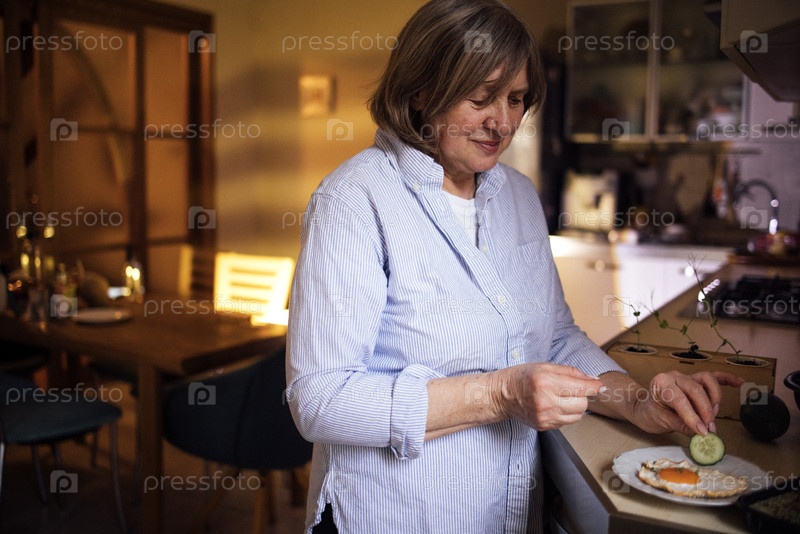 Пожилая женщина готовит здоровую еду с кусочком огурца на тарелке в современной кухне с деревянным столом и стульями на заднем плане