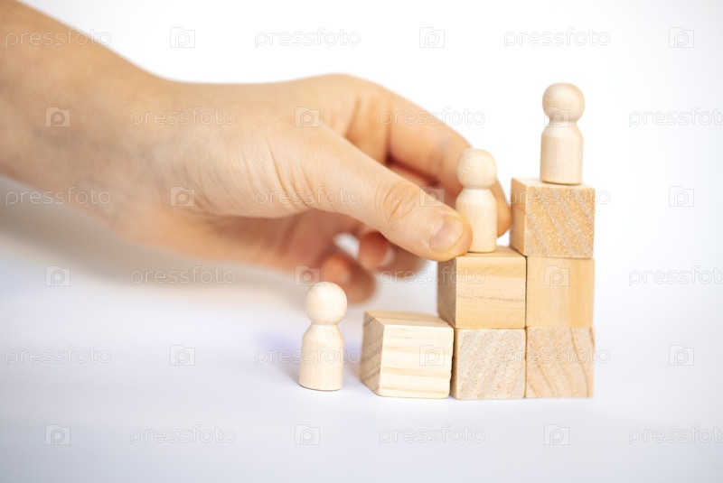 Рука помещает деревянную статуэтку наверху наложенных блоков, изображая небольшую лестницу из кубиков и цилиндров с дополнительными фигурками у основания
