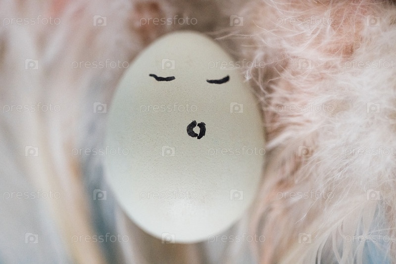 Декоративное яйцо с минималистическим дизайном лица, опирающимся на мягкие перья, демонстрирует уникальный художественный подход к пасхальному или весеннему тематическому декору