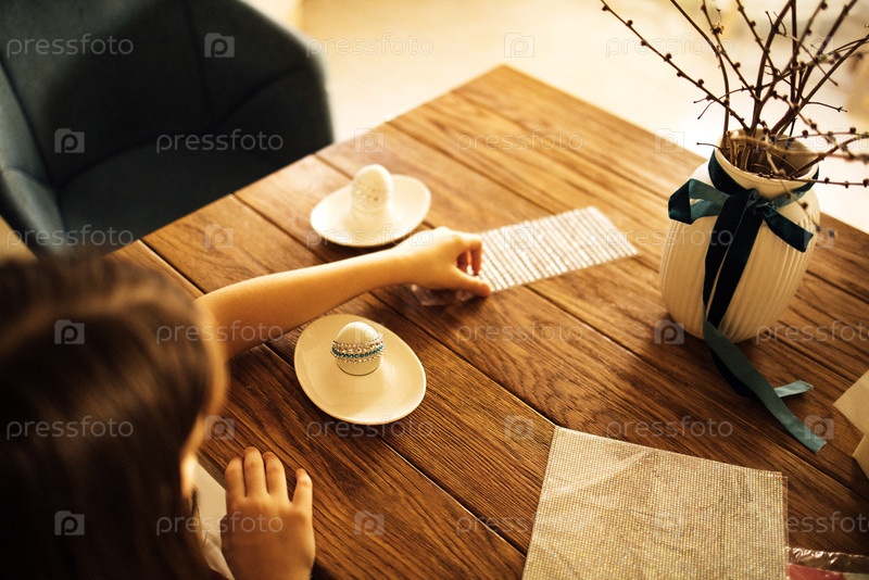 Детская рука, тянущаяся к декоративному пасхальному яйцу на деревянном столе с рисунковой салфеткой и вазой из веток, уютная внутренняя обстановка с мягким освещением