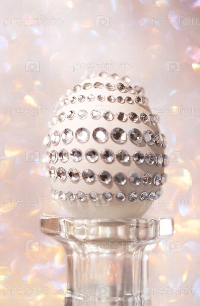Декоративное яйцо, украшенное стеклянными камнями, помещенным на стеклоподъемник, блестящий фон с мягким эффектом боке создает праздничную атмосферу