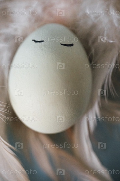 Декоративное яйцо с минималистическими чертами лица, опирающимися на мягкие перья, демонстрирует уникальный художественный дизайн в ближайшем виде