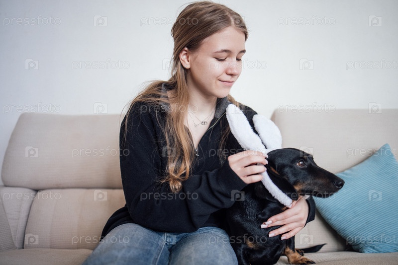 Молодая женщина с длинными волосами кладет кроличьи уши на черную собаку, сидя на бежевом диване с голубой подушкой в уютной комнате
