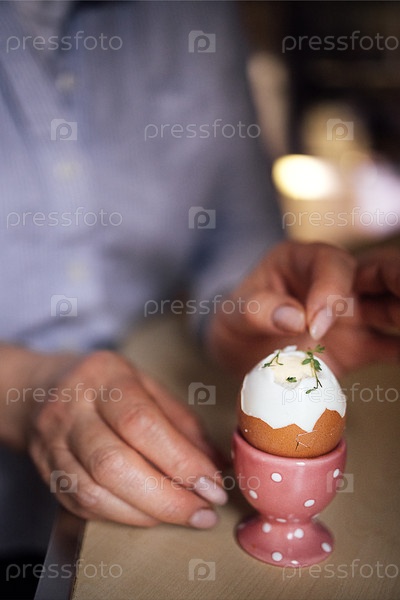 Близкий план рук, готовящих украшенное яйцо в розовой чашке с белыми точками на деревянном столе, мягкое освещение создает теплую атмосферу