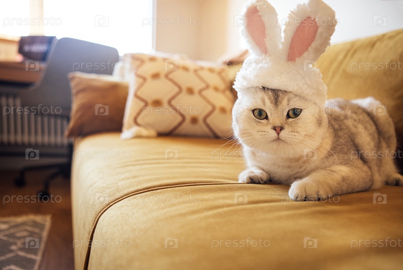 Кошка с кроличьими ушами сидит на желтом диване в уютной гостиной с декоративными подушками и столом, видимым на заднем плане