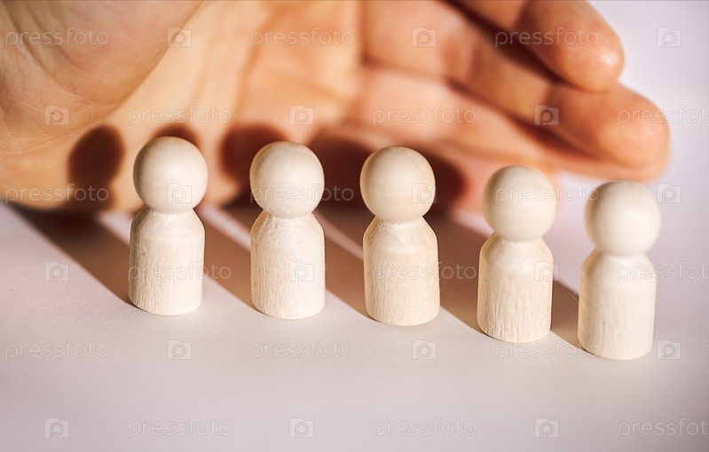 Рука расположена над пятью деревянными фигурками, расположенными в ряд, демонстрирующими различные высоты и формы на легкой поверхности, подчеркивая мастерство и дизайн