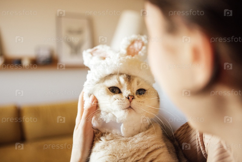 Домашняя кошка в пушистой кроличьей шляпе, которую держит человек в уютной помещенной обстановке с мягким освещением и размытым фоном