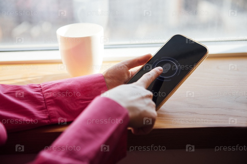 Женщина-пользовательница в розовой рубашке взаимодействует со смартфоном на деревянной подоконнице, чашка для кофе видна на заднем плане и фокусируется на функции распознавания отпечатков пальцев