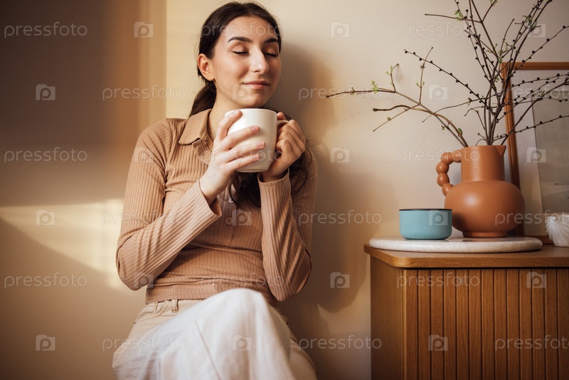 Молодая женщина с длинными темными волосами держит чашку кофе, сидя возле деревянного стола, украшенного декоративными вазами и ветвями в уютном помещении