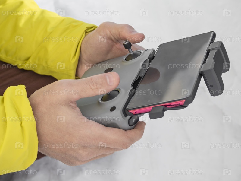 Руки человека, держащего беспроводный пульт дистанционного управления квадрокоптером со смартфоном