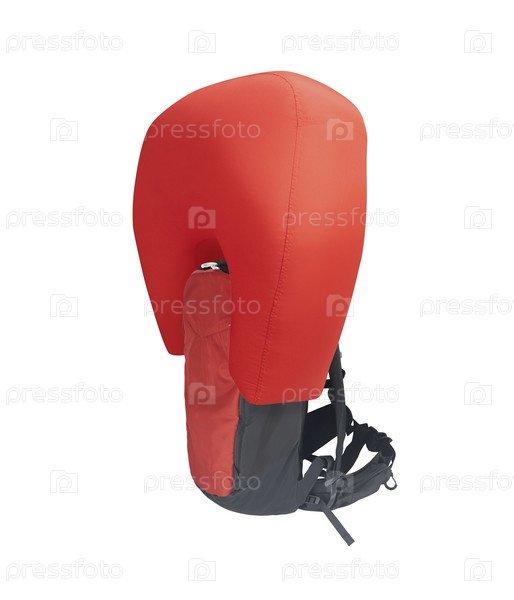 Боковой вид красного надутого воздушного подушки лавины рюкзак изолированный на белом фоне