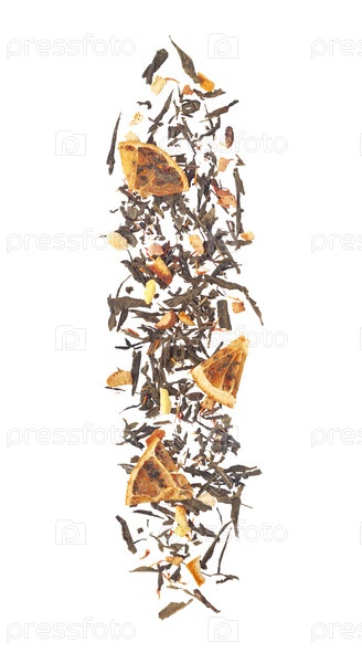 Куча зеленого чая с апельсином и другими сухими фруктами, изолированными на белом фоне